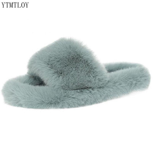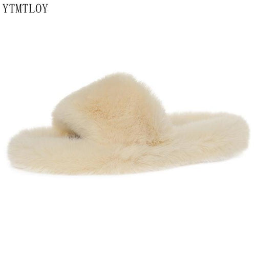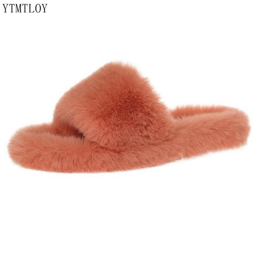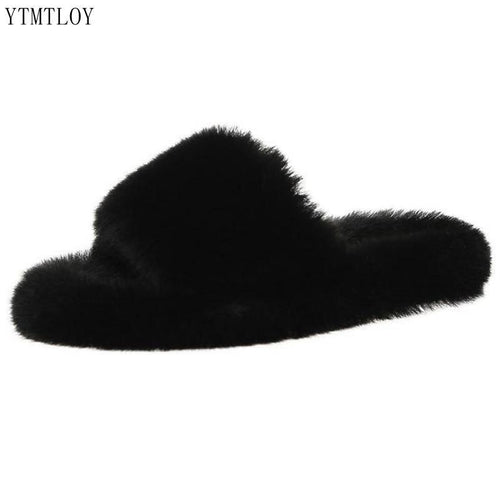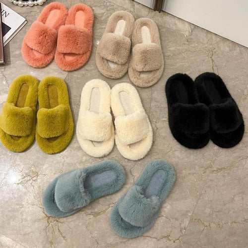 Home Slippers Women's Flat Shoes Female Lady Fur Flip Flops Slides Soft Plush Cotton Indoor Winter